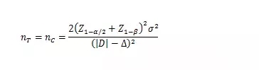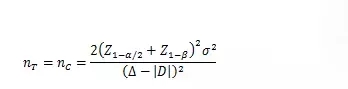 以下公式中,nT、nC分別為試驗(yàn)組和對照組的樣本量;Z1-α/2、Z1-β為標(biāo)準(zhǔn)正態(tài)分布的分?jǐn)?shù)位,當(dāng)α=0.05時(shí),Z1-α/2=1.96,當(dāng)β=0.2時(shí),Z1-β=0.842;(Z1-α/2+Z1-β)2=7.85